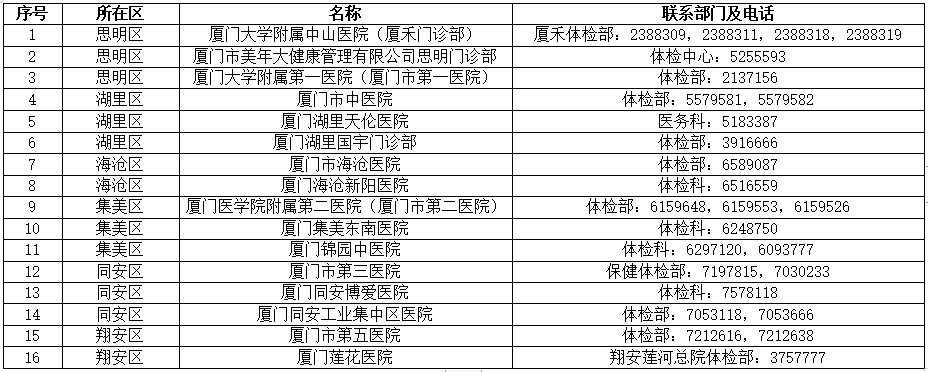 厦门市职业健康检查机构名单(截至2024年4月19日,最新信息以福建省卫生健康委员会官网公示为准,查找路径:网站首页-概况信息-机关处室-职业健康处-政策文件)