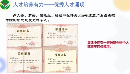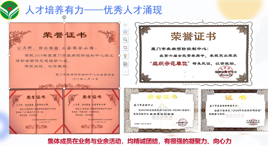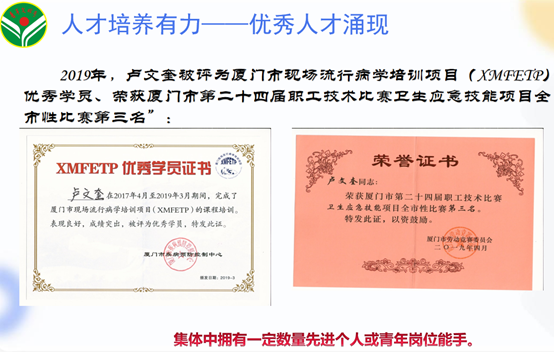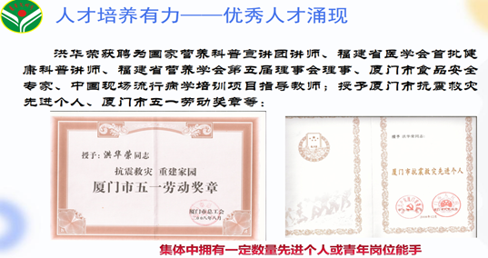 公共卫生科坚持大力弘扬敬业、协作、创优、奉献的精神,号召全体职员牢固树立“一切为了人民健康”工作宗旨,以“监测干预促健康 青春同行创文明”为创建口号,最大助力健康中国建设,为服务人民全生命周期健康贡献青春力量。科室先后于2013年及2016年被共青团厦门市委员会授予“市级青年文明号”荣誉称号,于2017年被厦门市总工会授予“厦门市工人先锋号”荣誉称号。